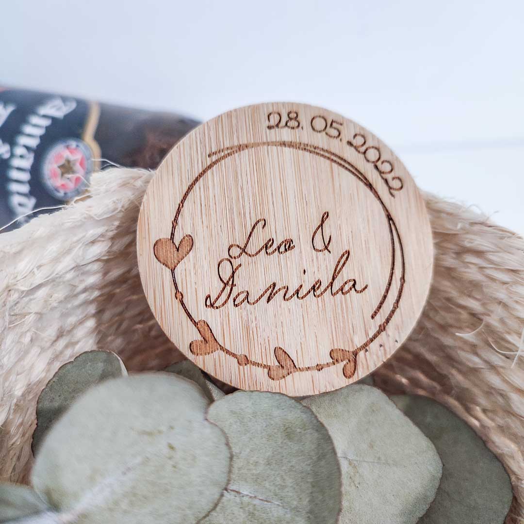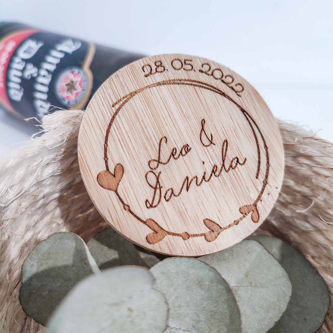 Etiqueta en cartulina blanca o color kraft con nombre de los novios/comunión/bautizo y la fecha del evento.
