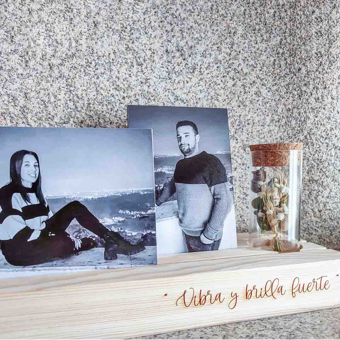 Base de madera de haya maciza para dos fotos de 10*15 y 12*12 con botella de cristal y flor seca.