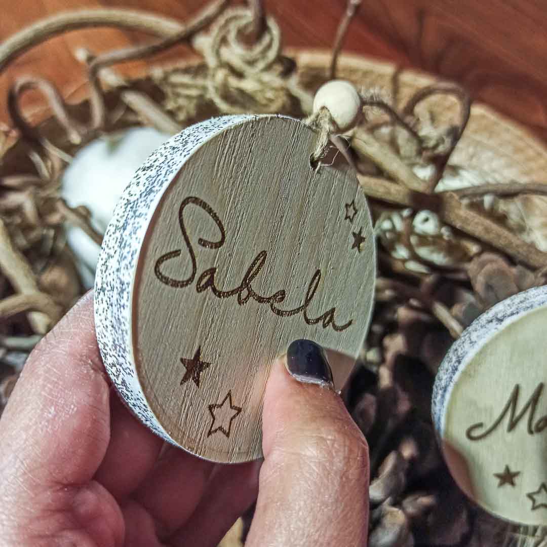 Adorno de navidad personalizado, realizado en contrachapado de fresno y decorado con purpurina alrededor.