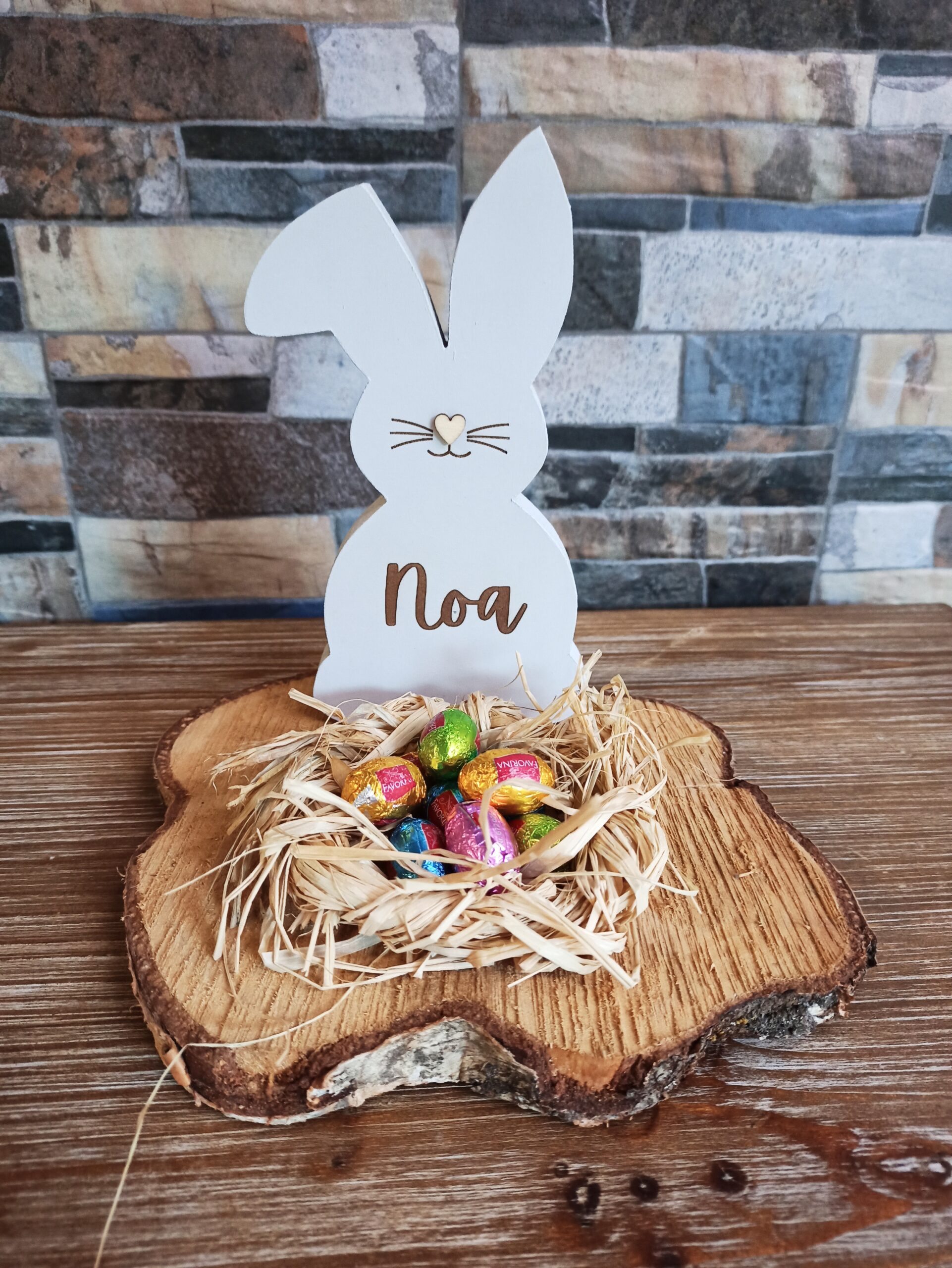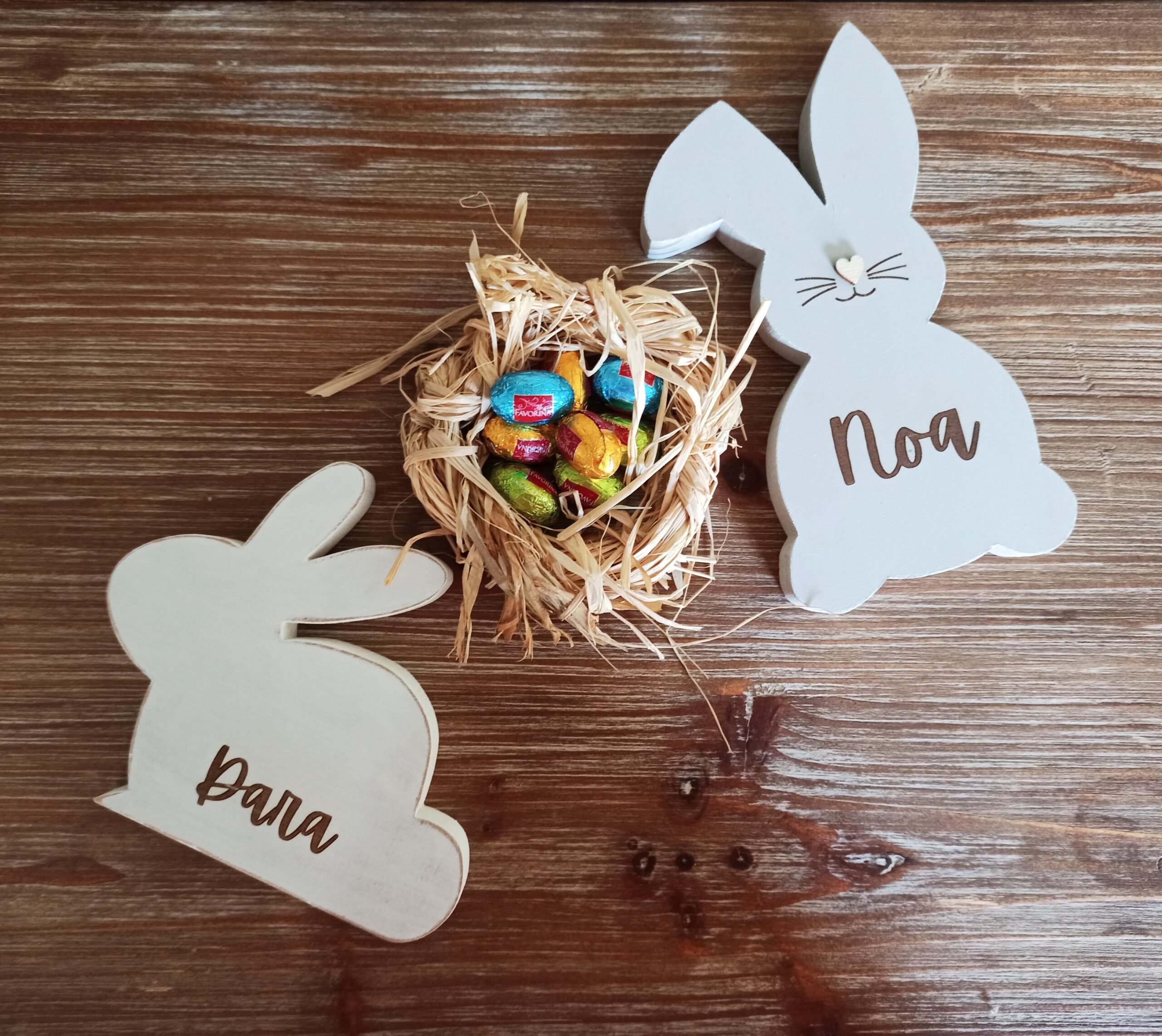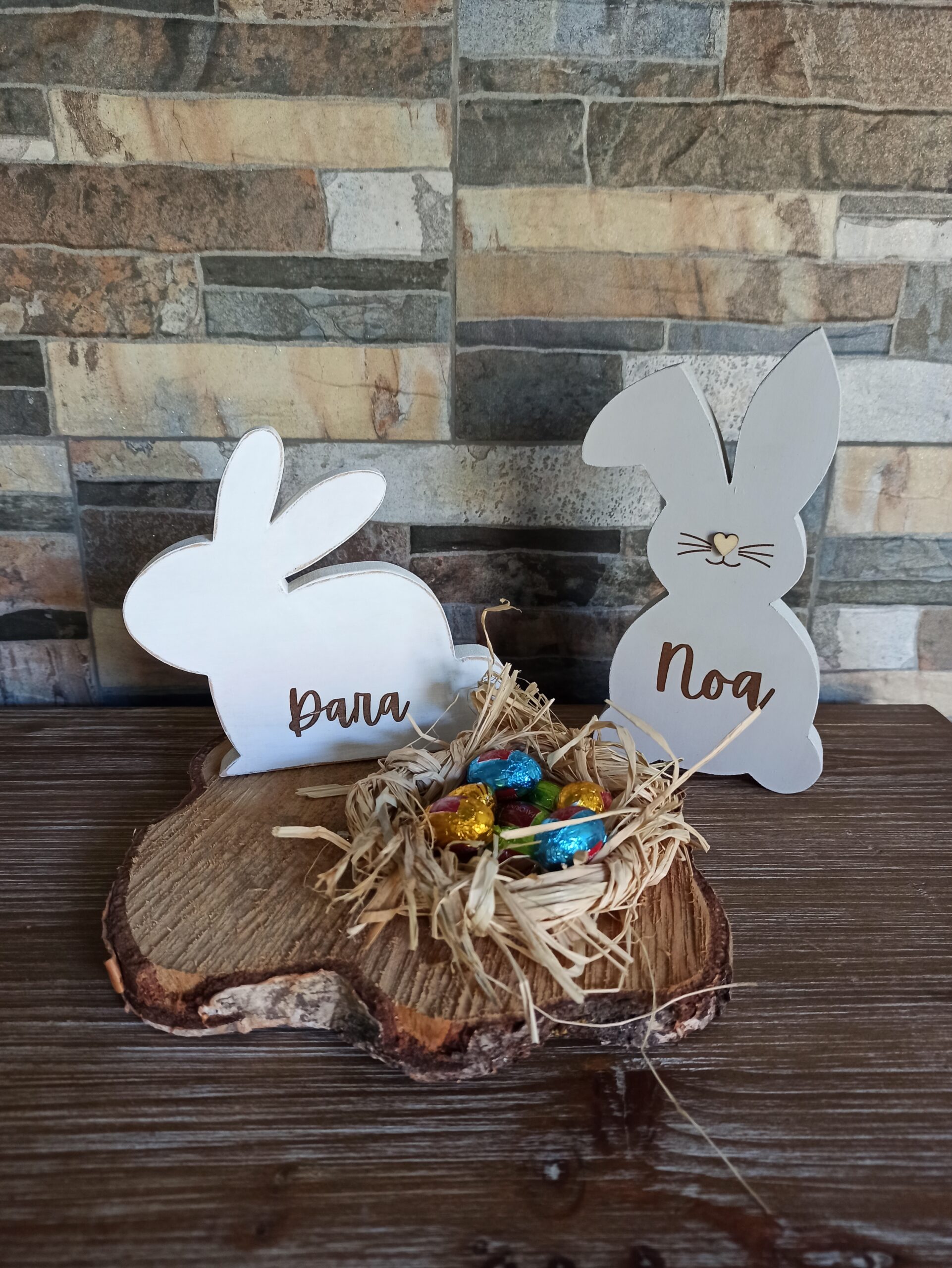 Conejito de pascua realizado en MDF de 16 mm de grosor, grabado nombre.