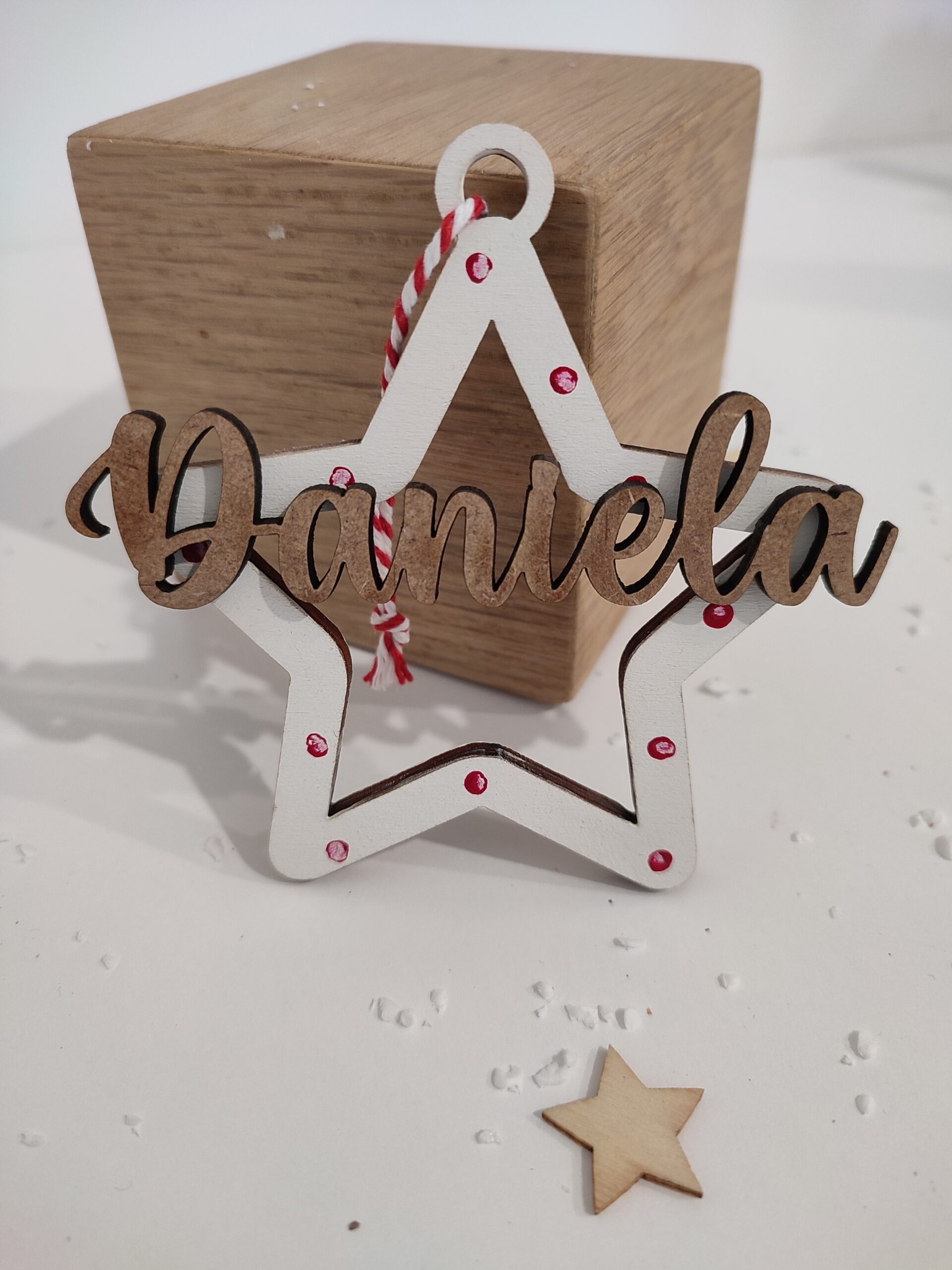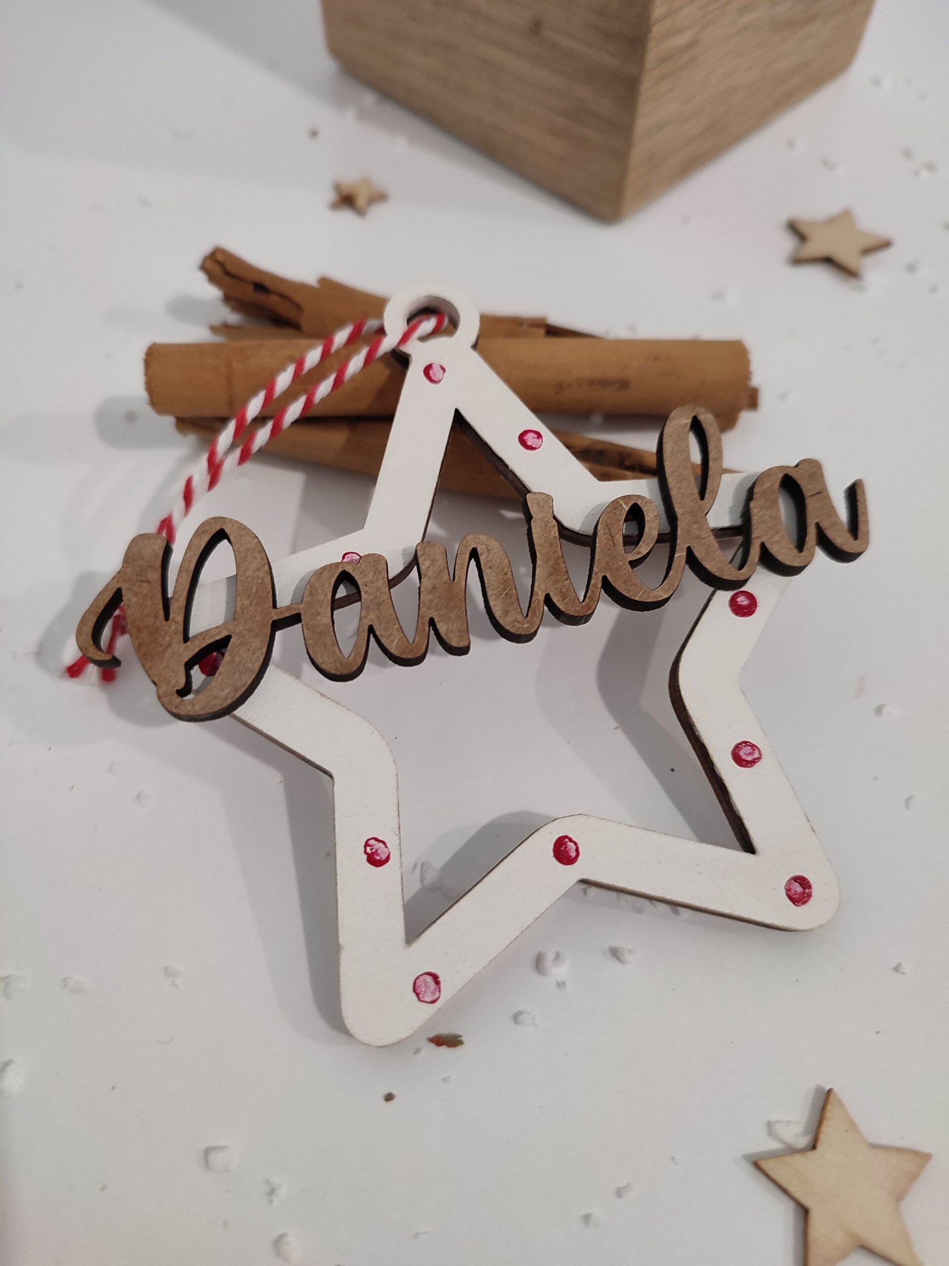 Adorno estrella árbol en color blanco, realizada en MDF con nombre en relieve.