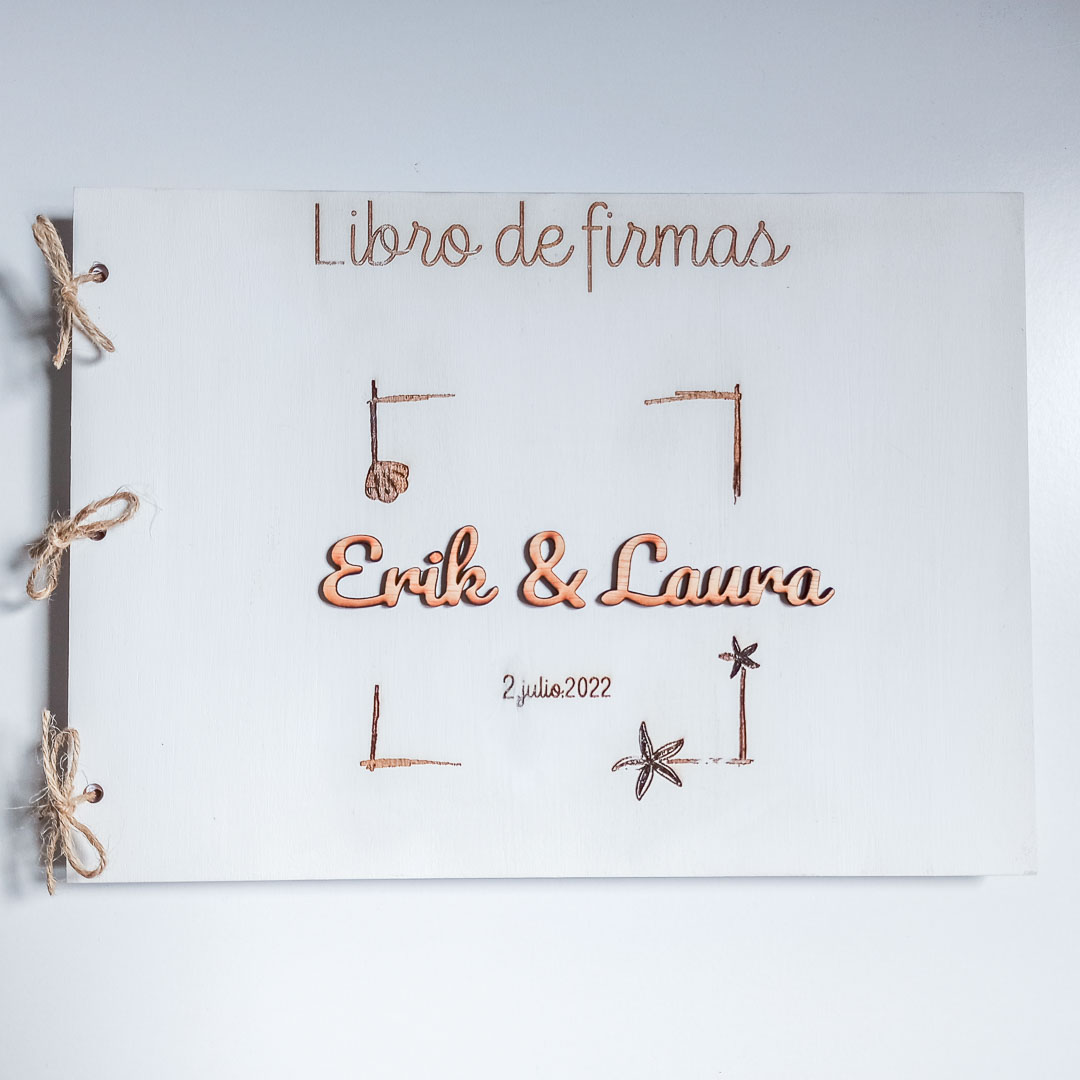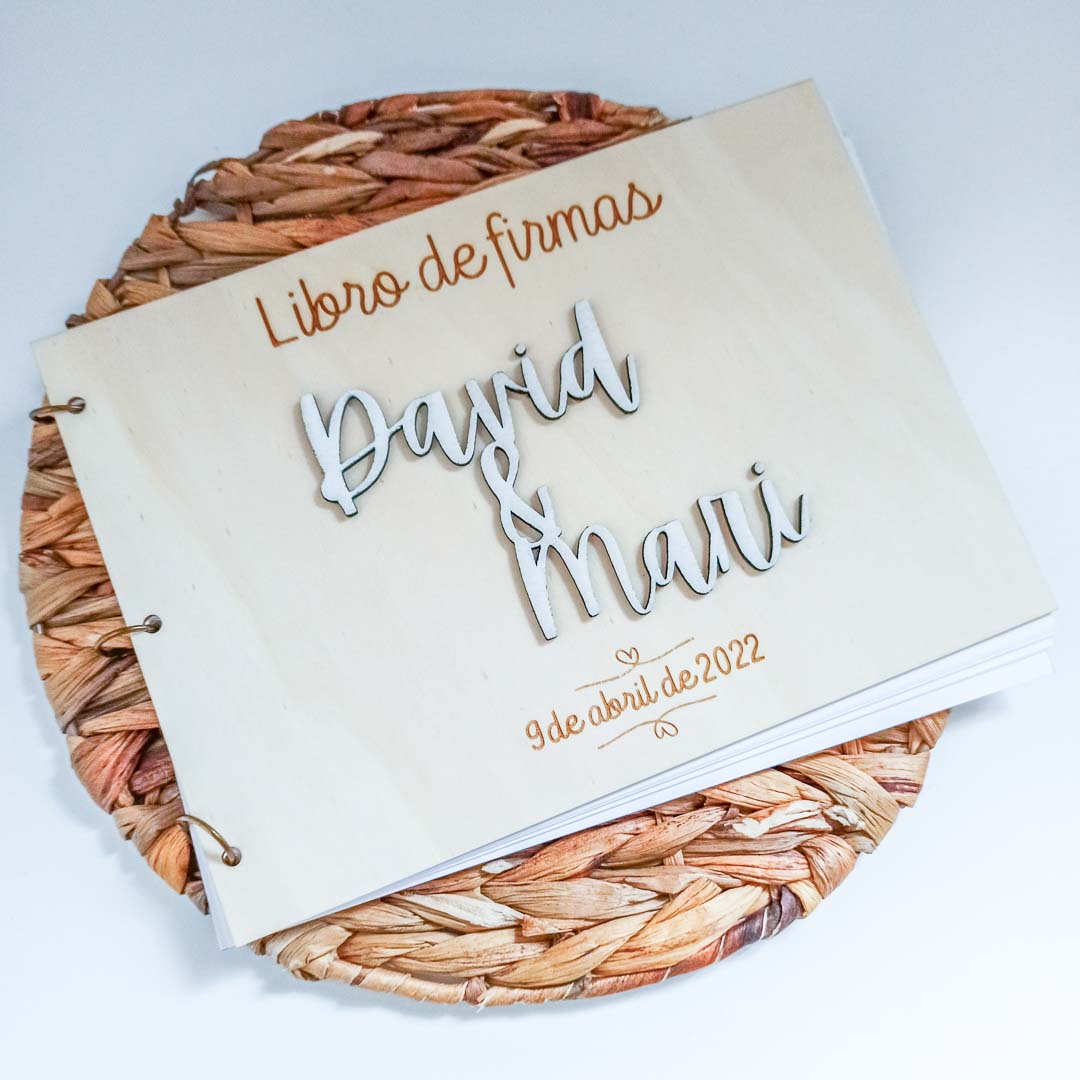 Libro de firmas en contrachapado de okumen con 10 cartulinas en color blanco. Incluye 3 anillas.