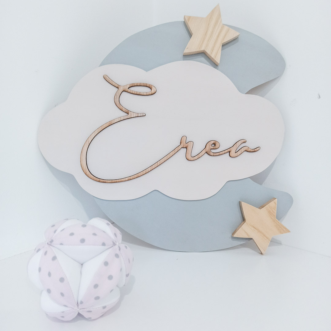 Pack personalizado compuesto por luna decorativa de pared / puerta y pelota montessori.