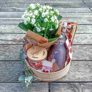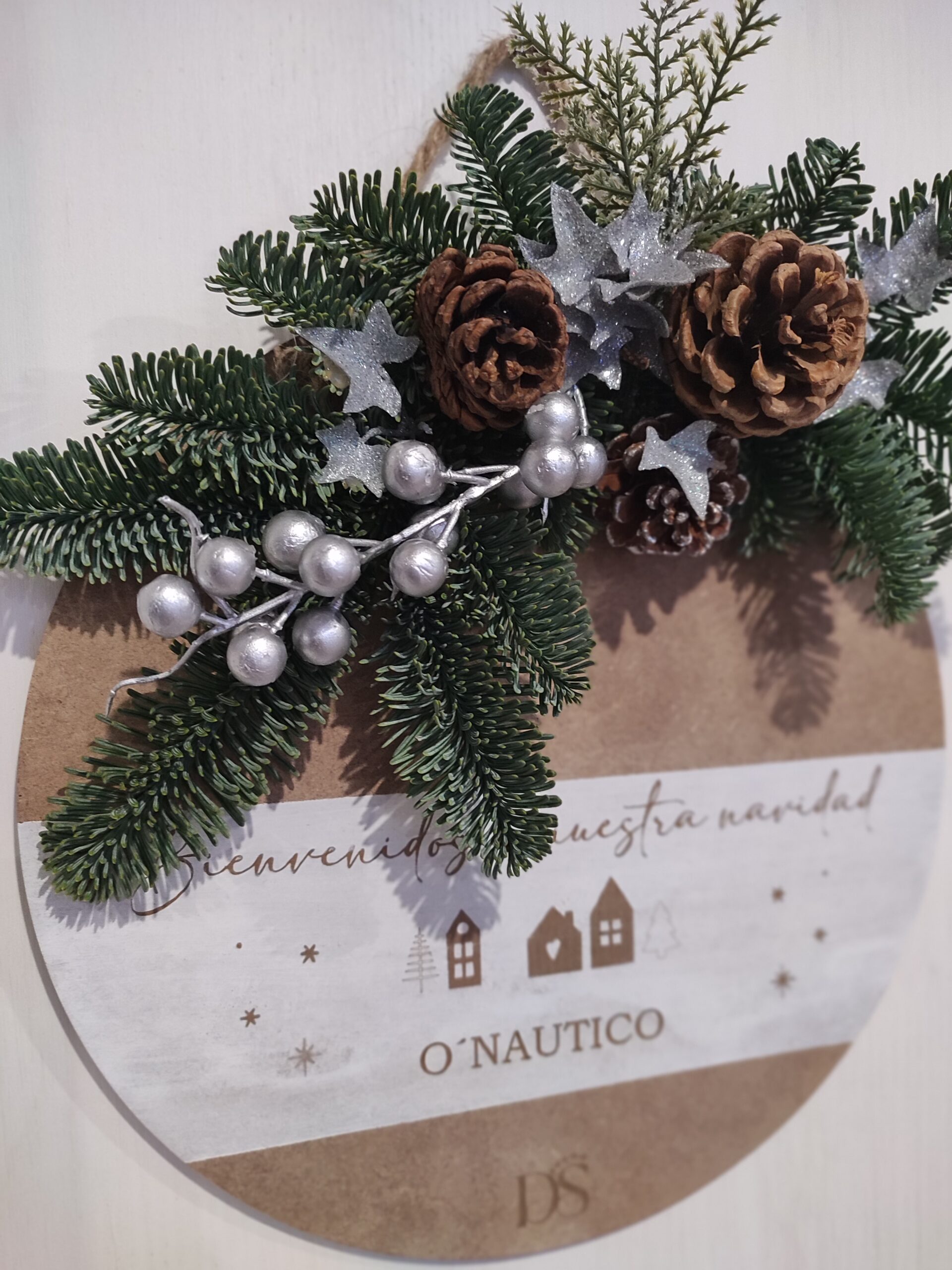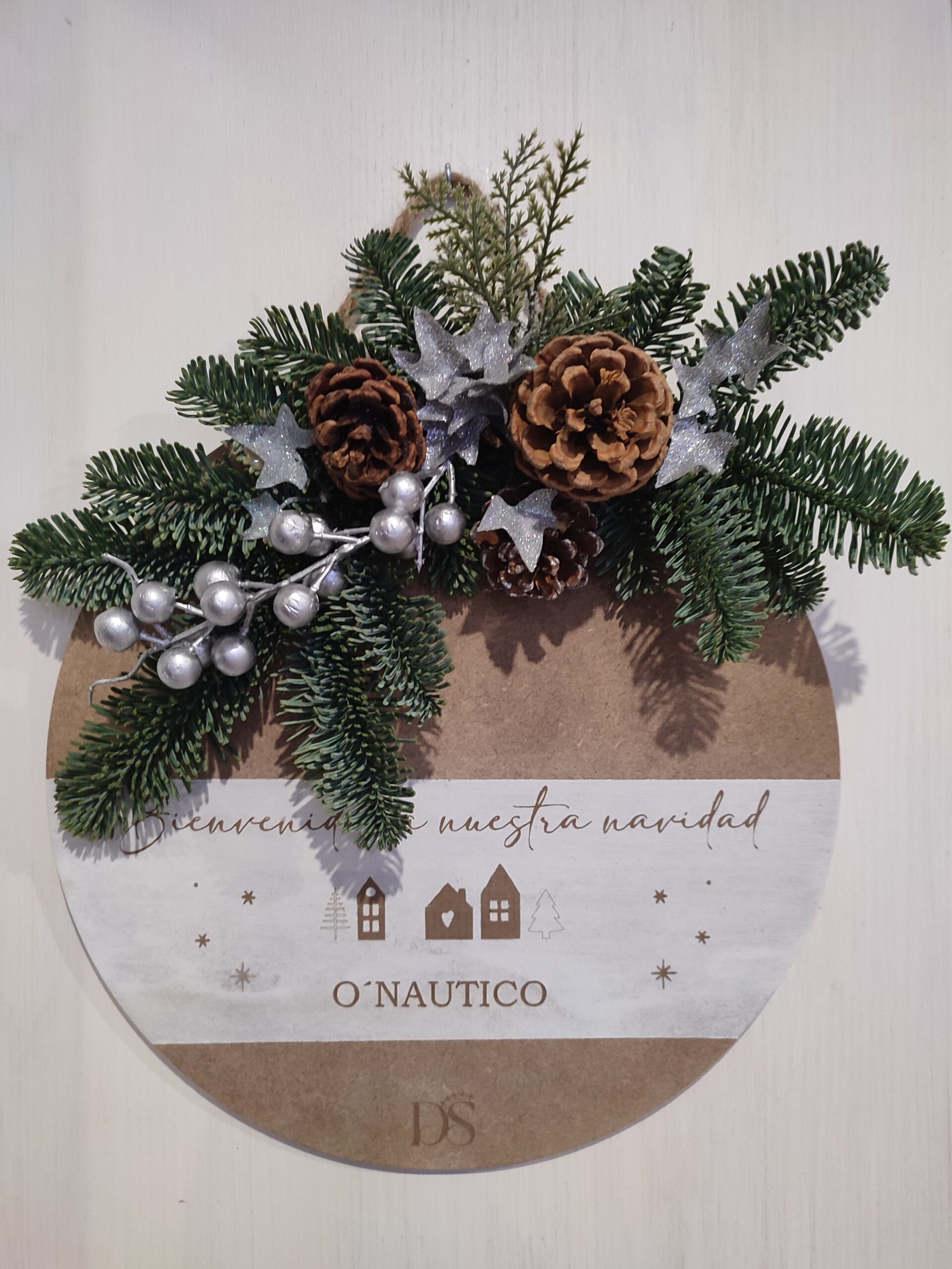 Placa bienvenidxs a nuestra navidad, decorada con abeto natural y elementos decorativos artificiales.