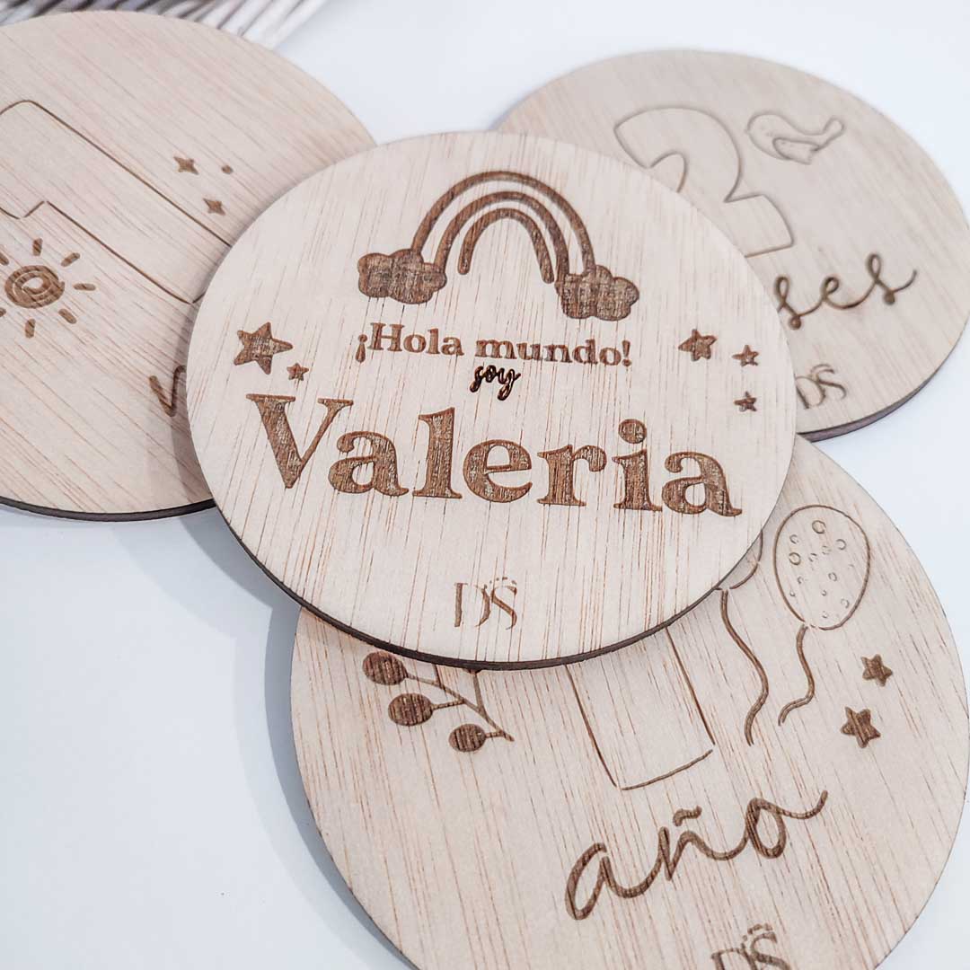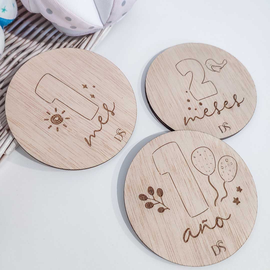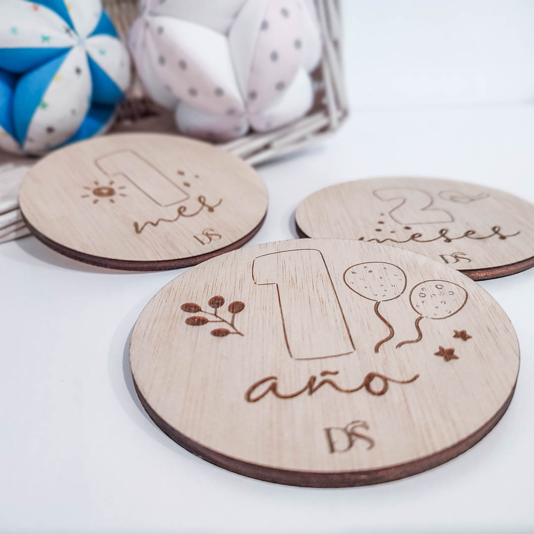 Placas cumple mes en madera de okumen de 4 mm de grosor.