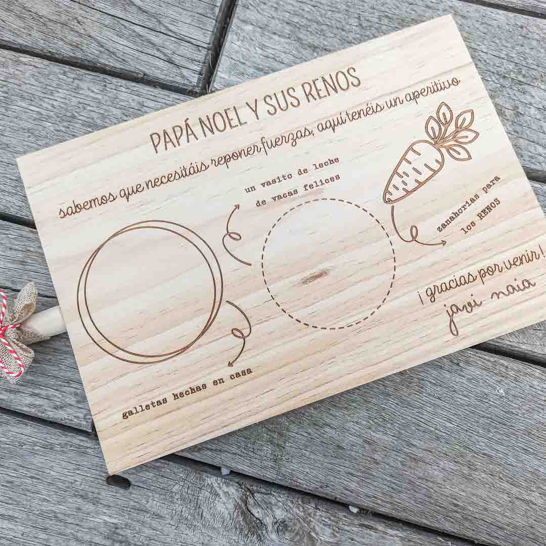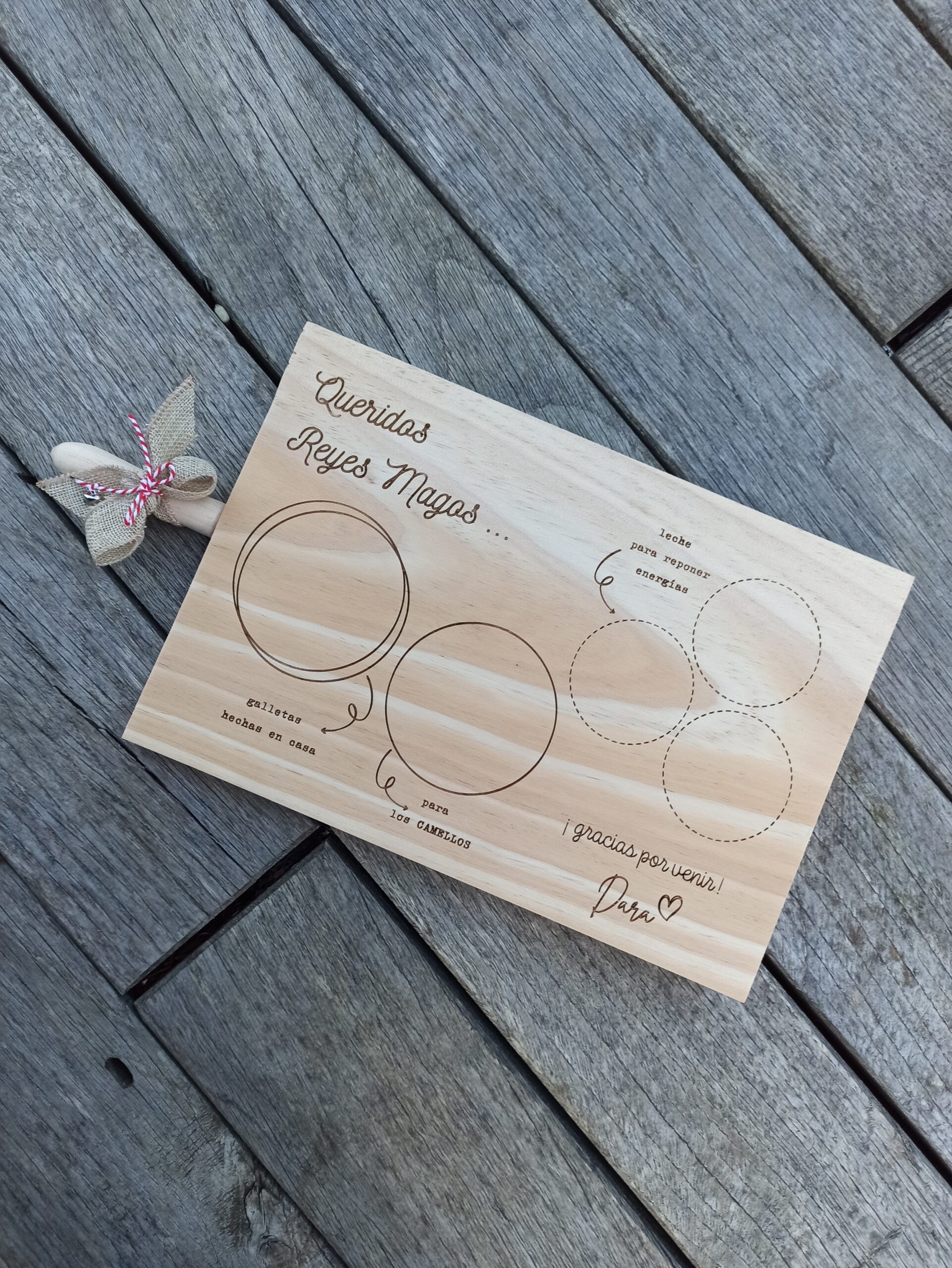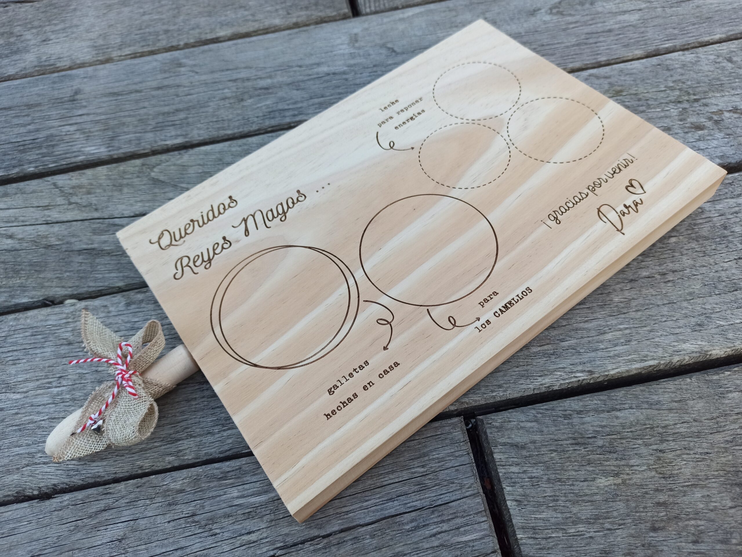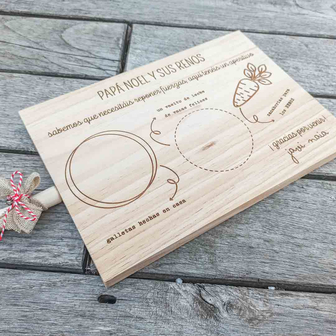 Bandeja de madera de pino personalizada para dar la bienvenida a Papá Noel o a los Reyes Magos.